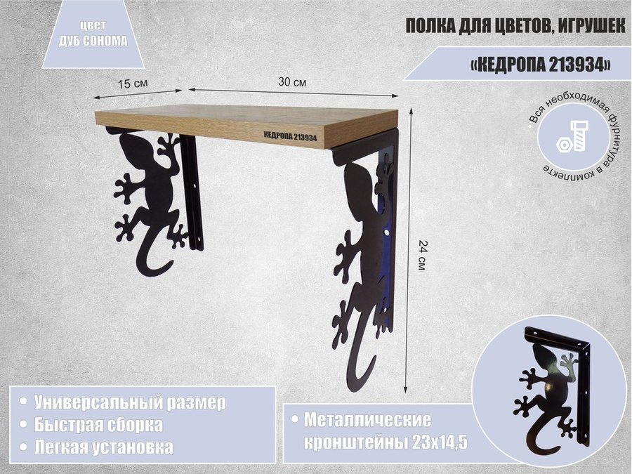 В корзину Купить в 1 клик Полка для цветов, игрушек,сувениров "КЕДРОПА-213934 гекон" размер 15х30х24 см, дуб сонома