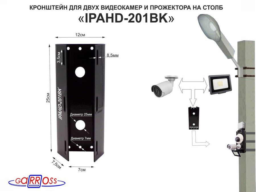 В корзину Купить в 1 клик Кронштейн для двух камер и прожектора на столб чёрный "IPAHD-201BK-89767" под СИП-ленту, вылет 80мм