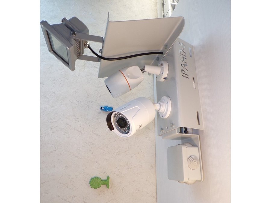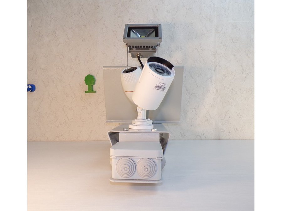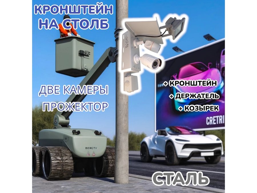 Кронштейн с козырьком и площадкой под монтажную коробку для крепления двух камер и прожектора на столб при помощи ленты или хомутов