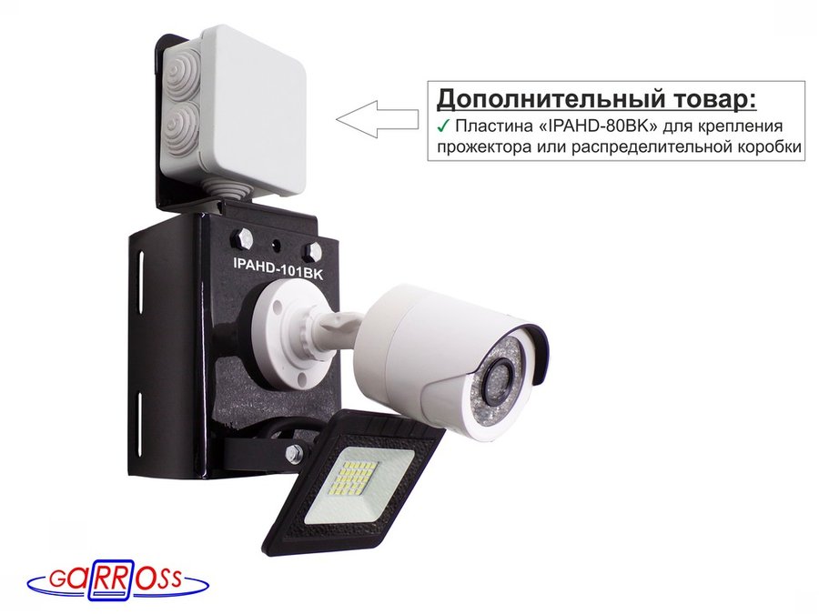 - Конструкция кронштейна позволяет крепить дополнительную опцию в виде разводной коробки, для укладки соединительных электропроводов от камеры и прожектора.