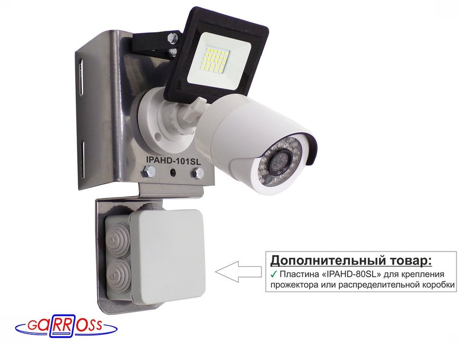 - Конструкция кронштейна позволяет крепить дополнительную опцию в виде разводной коробки, для укладки соединительных электропроводов от камеры и прожектора.