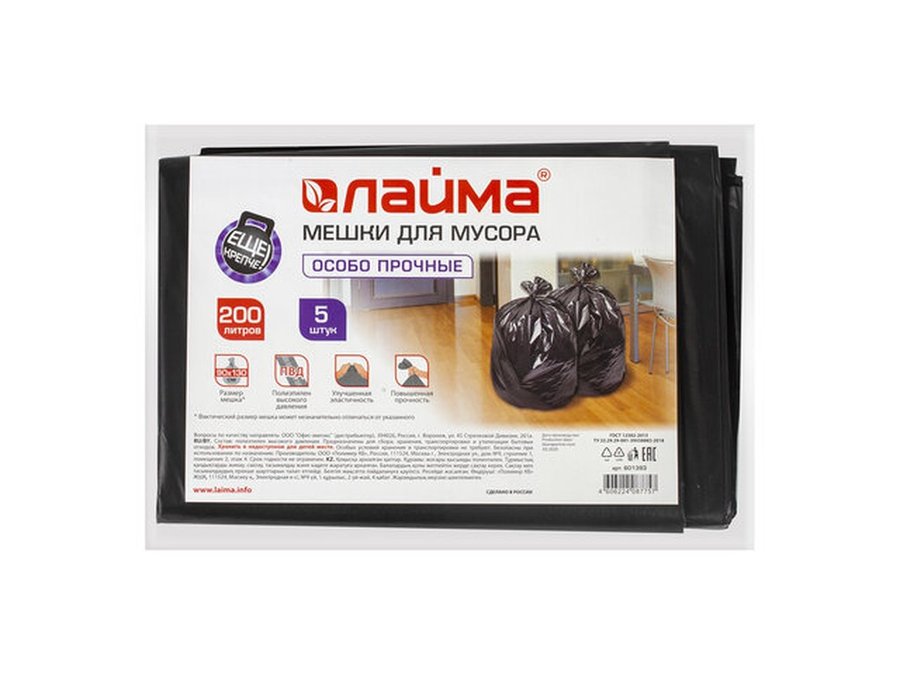 В корзину Купить в 1 клик Мешки для мусора 200литров, черные, в пачке 5шт, ПВД, 50мкм, 90х130см(+5%), особо прочные "BR-78271"