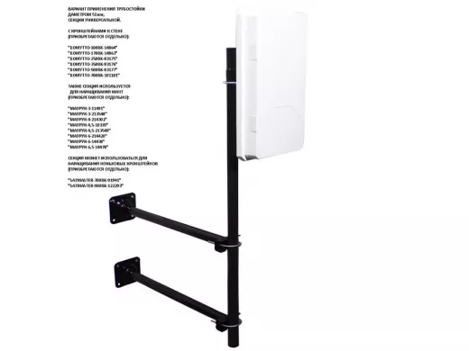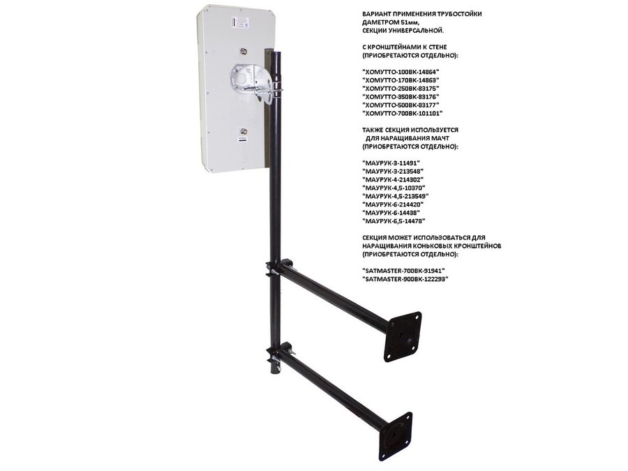 • Данную секцию можно использовать в качестве как нижнего звена мачты , т.к. в нижней части секции есть отвестия для установки подпятника, так и в качестве среднего или верхнего звена за счёт наличия болта для фиксации звена к звену на одном конце секции и обжатия трубы на другом конце. Также применяется с кронштейнами "ХОМУТТО"  для крепления к стене и на торец крыши анттенн, также подходит для коньковых кронштейнов серии "SATMASTER-700", "SATMASTER-900".