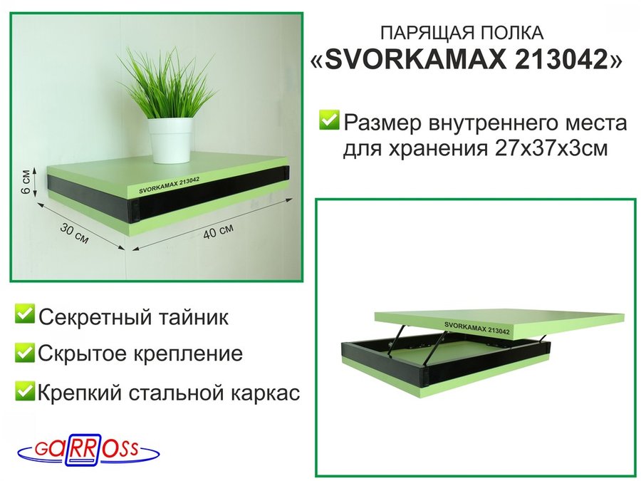 В корзину Купить в 1 клик Парящая полка скрытого крепления с тайником, черный "SVORKAMAX 213042" 30х40 см, салатовый
