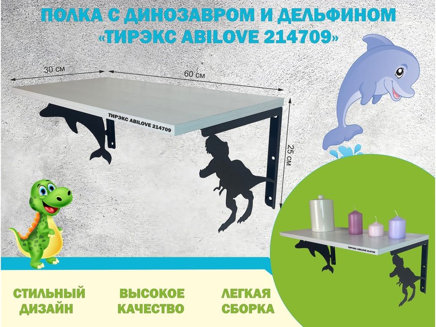 В корзину Купить в 1 клик Полка с динозавром и дельфином "ТИРЭКС ABILOVE-214708" для игрушек, дуб сонома, 30х60см