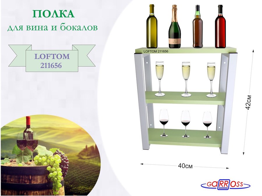 В корзину Купить в 1 клик Полка для вина и бокалов, высота 42см, 3 уровня, размер 10х40см, серая "LOFTOM 211656" салатовый