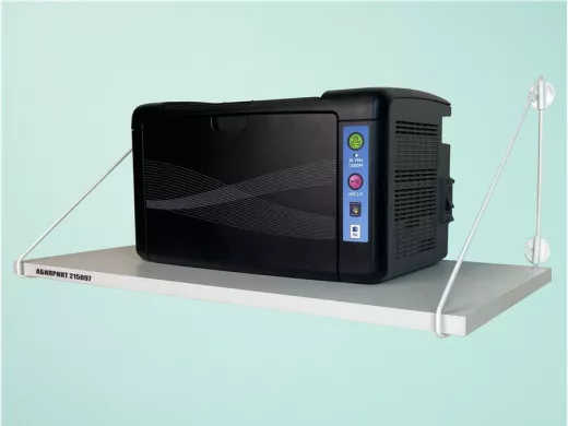 - Полка надежно крепится к стене при помощи анкеров или шурупов с дюбелями, на ней можно разместить принтер, бумагу и многое другое