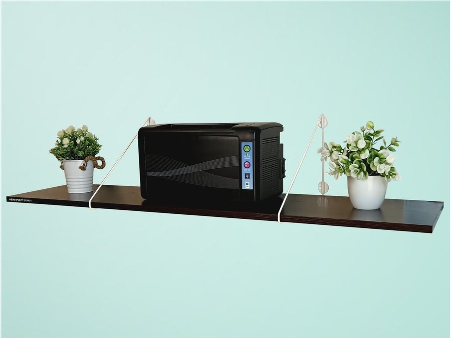 - Полка надежно крепится к стене при помощи анкеров или шурупов с дюбелями, на ней можно разместить принтер, бумагу