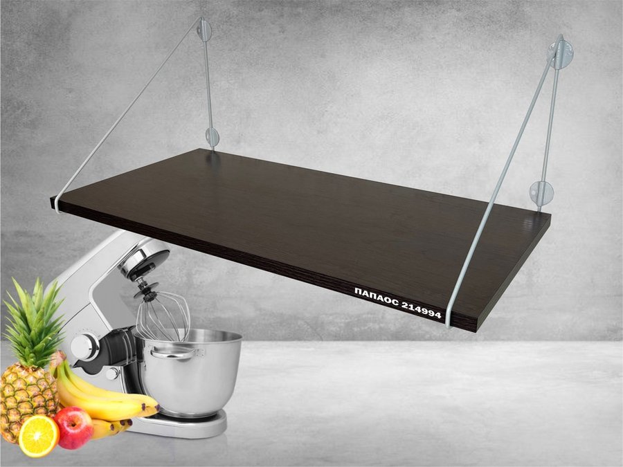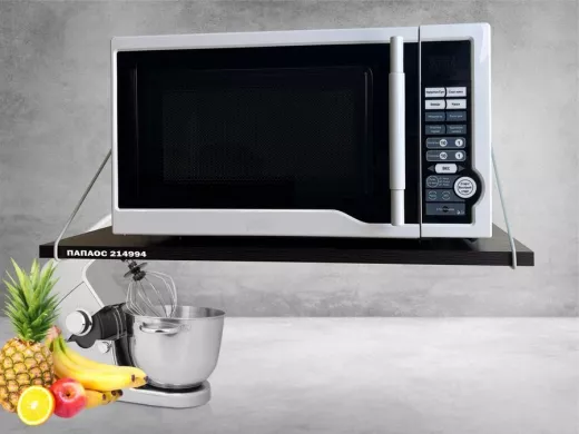 - Полка надежно крепится к стене при помощи анкеров или шурупов с дюбелями, на ней можно разместить микроволновую печь, кухонную технику, посуду, специи и многое другое