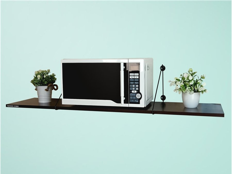 • Полка надежно крепится к стене при помощи анкеров или шурупов с дюбелями, на ней можно разместить микроволновую печь, кухонную технику, посуду, специи