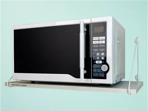 - Полка надежно крепится к стене при помощи анкеров или шурупов с дюбелями, на ней можно разместить микроволновую печь, кухонную технику, посуду, специи
