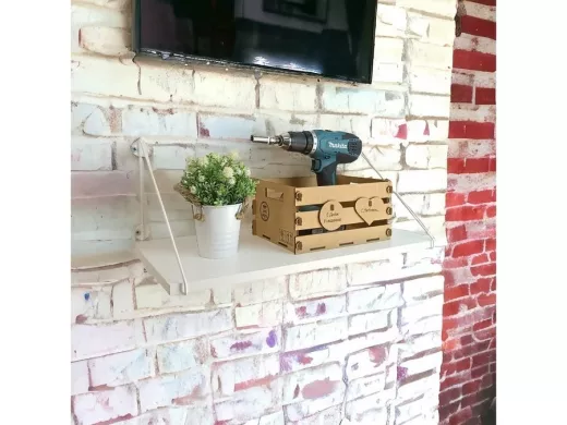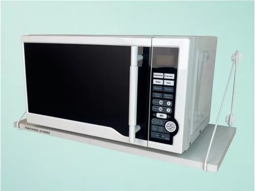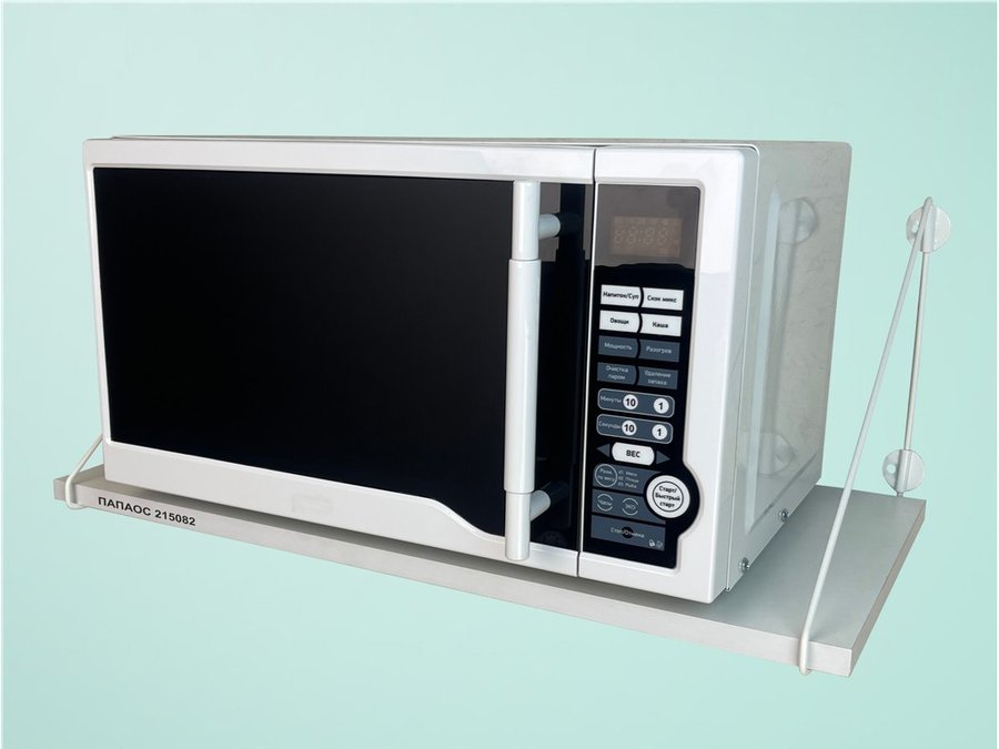 • Полка надежно крепится к стене при помощи анкеров или шурупов с дюбелями, на ней можно разместить микроволнрвую печь, кухонную технику, посуду, специи.