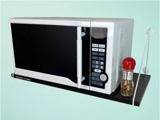 - Полка надежно крепится к стене при помощи анкеров или шурупов с дюбелями, на ней можно разместить микроволновую печь, кухонную технику, посуду, специи