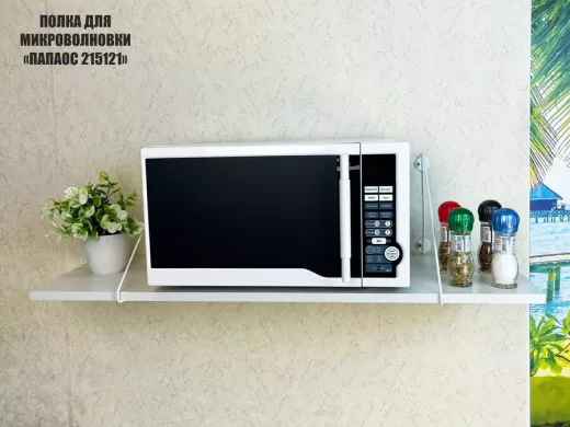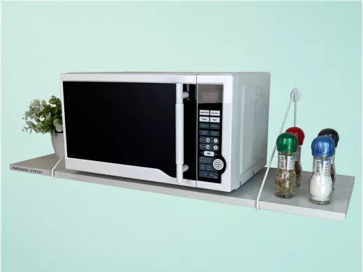 • Полка надежно крепится к стене при помощи анкеров или шурупов с дюбелями, на ней можно разместить микроволновую печь, кухонную технику, посуду, специи