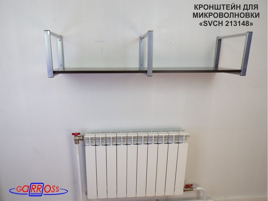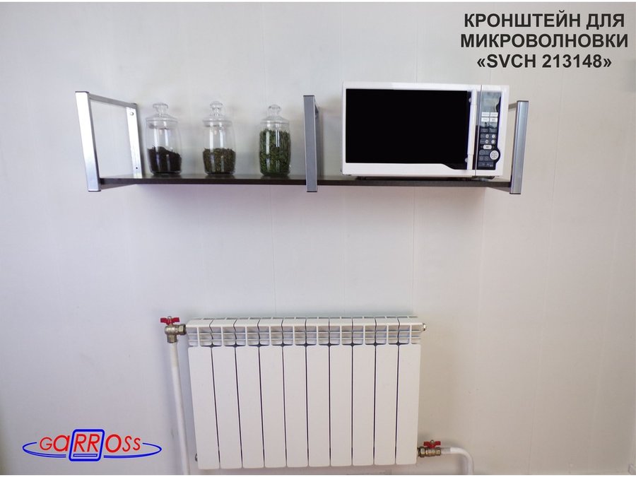 - Полка надежно крепится к стене при помощи анкеров или шурупов с дюбелями, на ней можно разместить микроволнрвую печь, кухонную технику, посуду, специи