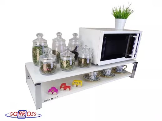 • Полка надежно крепится к стене при помощи анкеров или шурупов с дюбелями, на ней можно разместить микроволнрвую печь, кухонную технику, посуду, специи