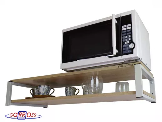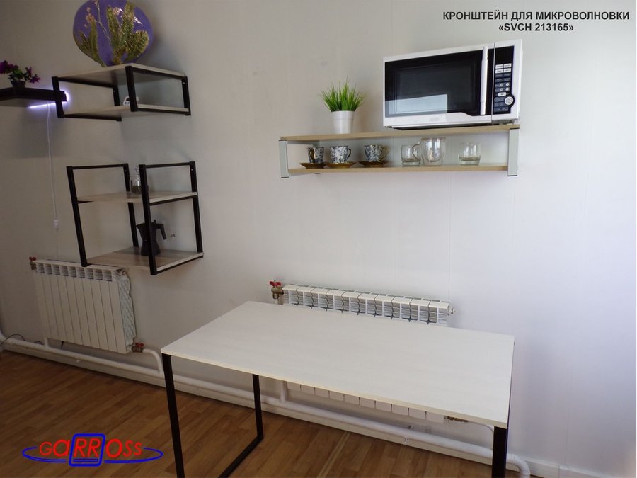 • Полка надежно крепится к стене при помощи анкеров или шурупов с дюбелями, на ней можно разместить микроволнрвую печь, кухонную технику, посуду, специи