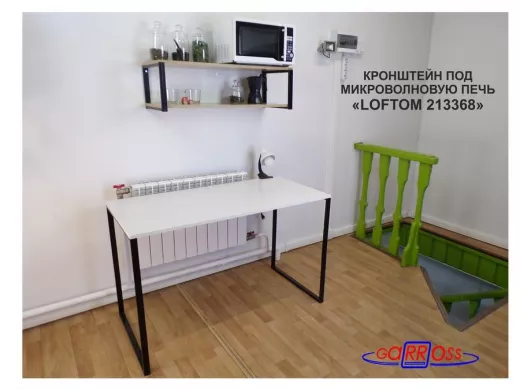 - Полка надежно крепится к стене при помощи анкеров или шурупов с дюбелями, на ней можно разместить микроволновую печь, кухонную технику, посуду, специи