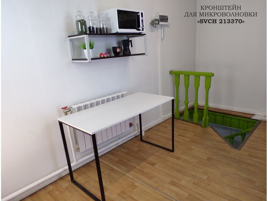 • Полка надежно крепится к стене при помощи анкеров или шурупов с дюбелями, на ней можно разместить микроволновую печь, кухонную технику, посуду, специи