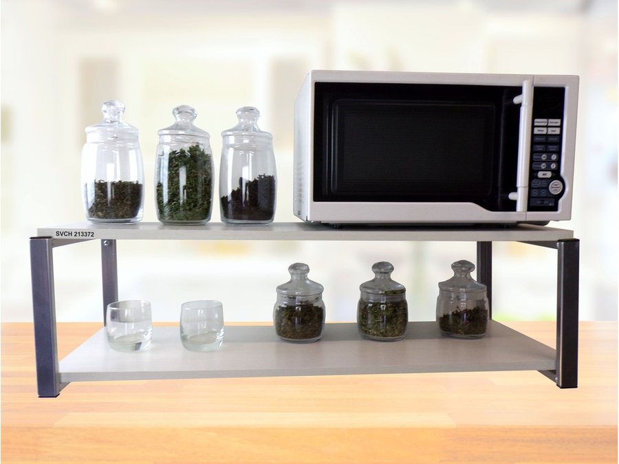 • Полка надежно крепится к стене при помощи анкеров или шурупов с дюбелями, на ней можно разместить микроволновую печь, кухонную технику, посуду, специи