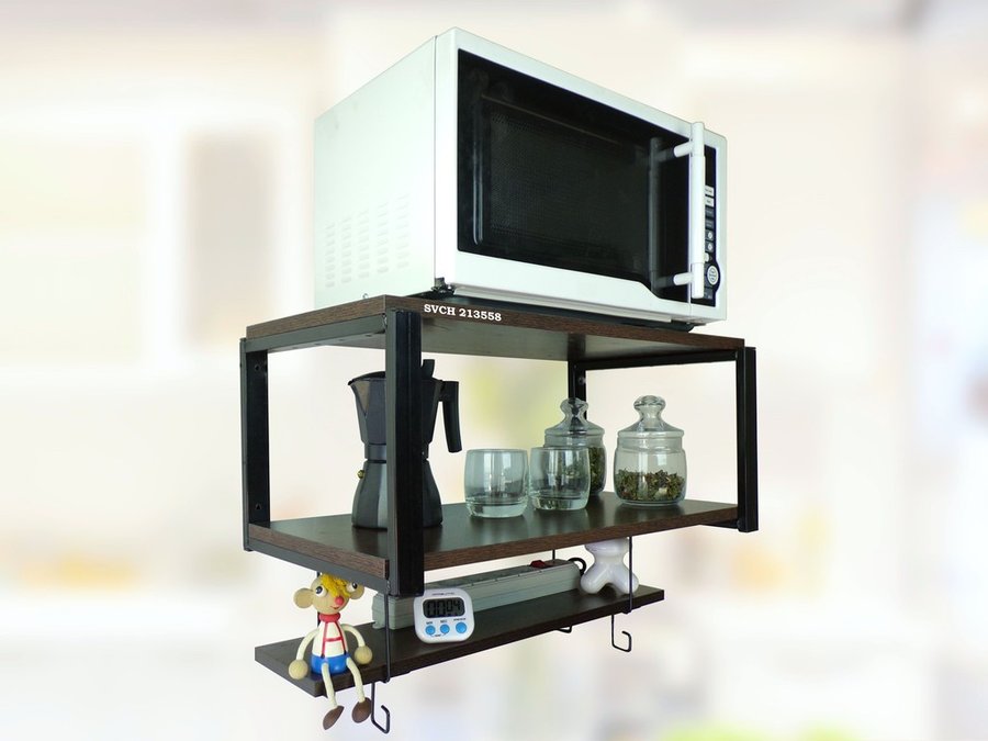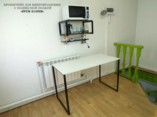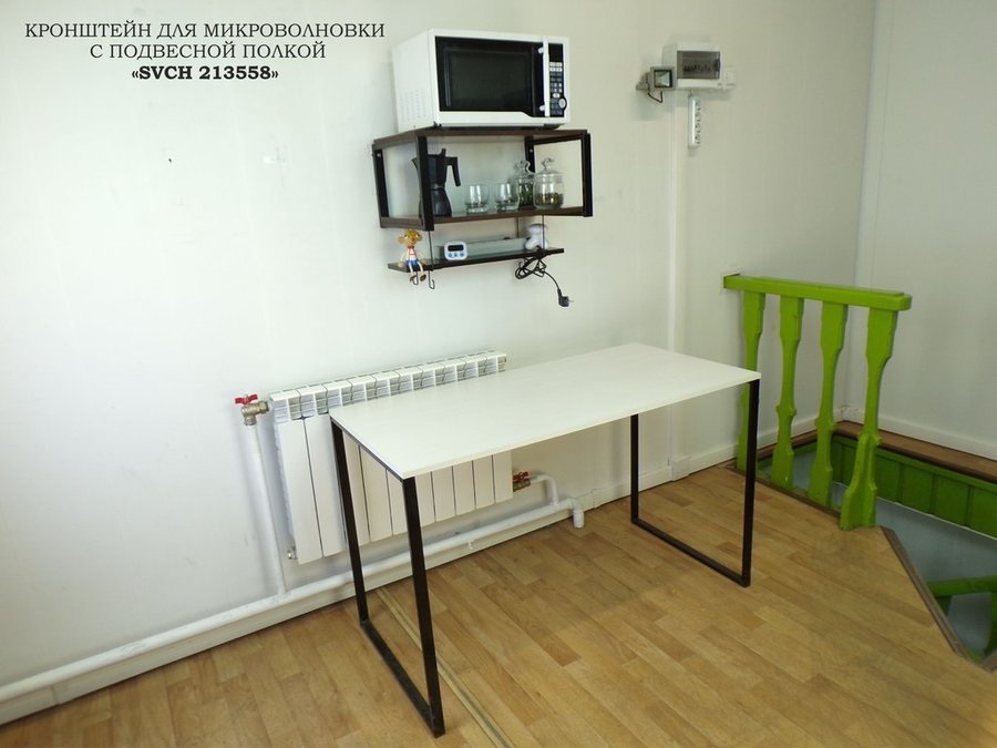 • Полка надежно крепится к стене при помощи анкеров или шурупов с дюбелями, на нее можно разместить микроволновую печь, кофемашину, тостер и другую кухонную технику, посуду, специи, различные необходимые мелочи