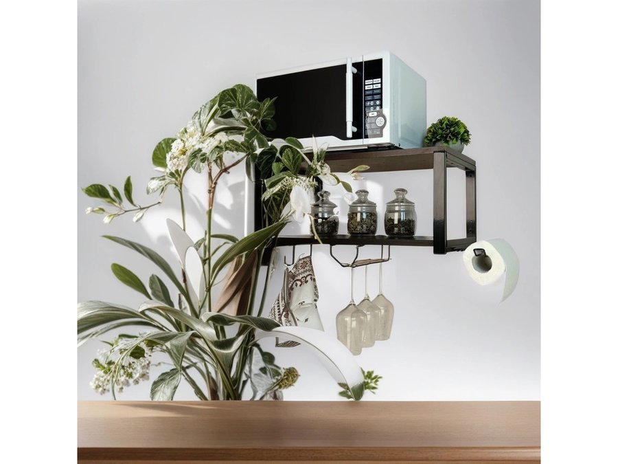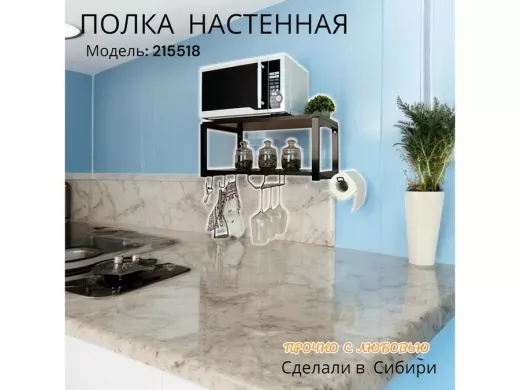 • Полка надежно крепится к стене при помощи анкеров или шурупов с дюбелями, на ней можно разместить микроволновую печь, кухонную технику, посуду, специи