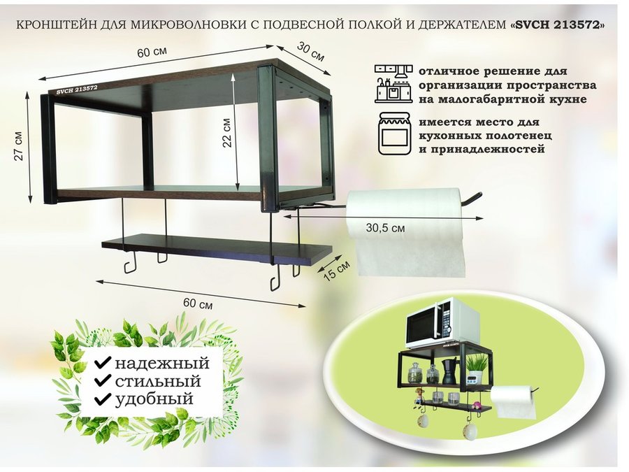 В корзину Купить в 1 клик Полка для микроволновки 60х30см с подвеской 40х15см, 27см, черный "SVCH 213579",сосна, с держателем