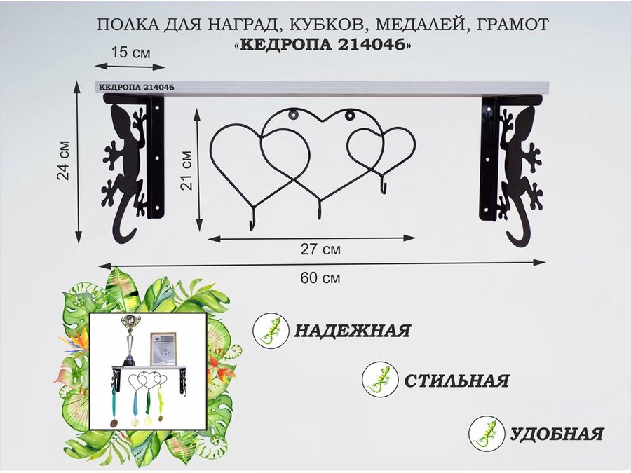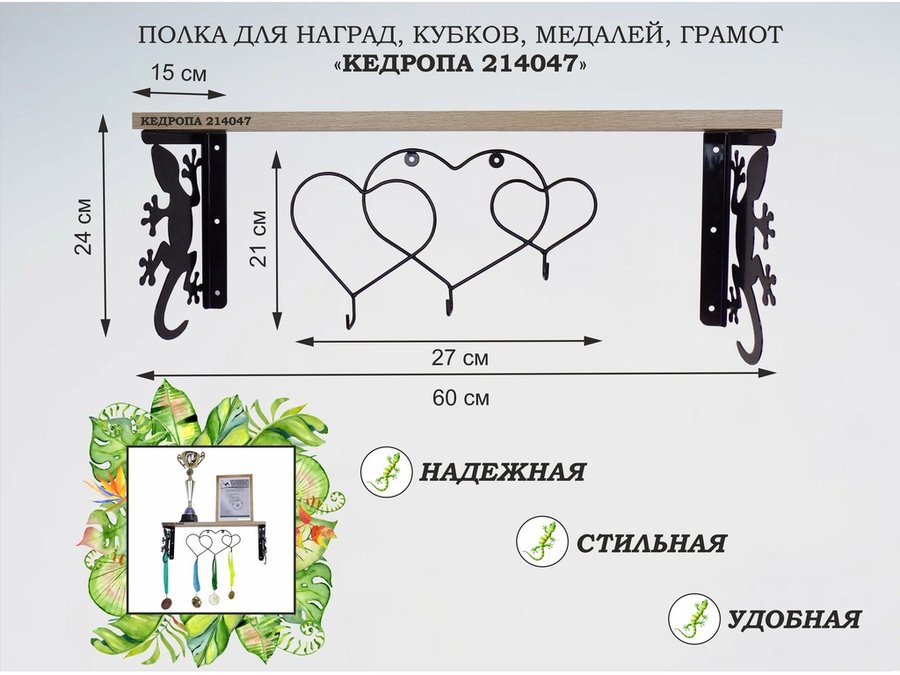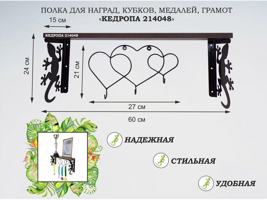 В корзину Купить в 1 клик Полка для наград, кубков, медалей, грамот "КЕДРОПА-214044 гекон" размер 15х60х24 см, дуб с сердцем