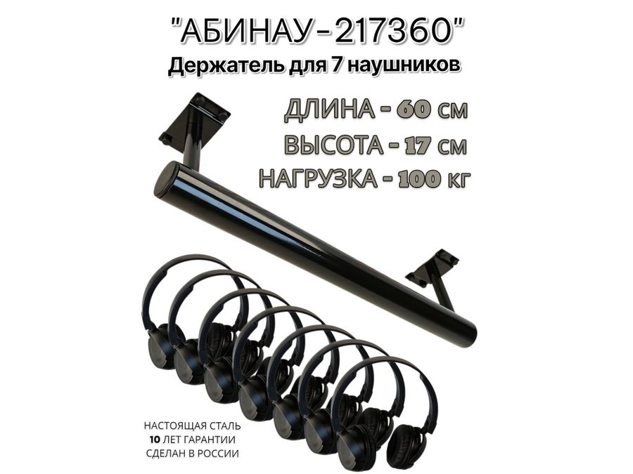В корзину Купить в 1 клик "АБИНАУ-217360" держатель для семи наушников, длина 60, высота 17 см, сталь, под стол,к стене,черный
